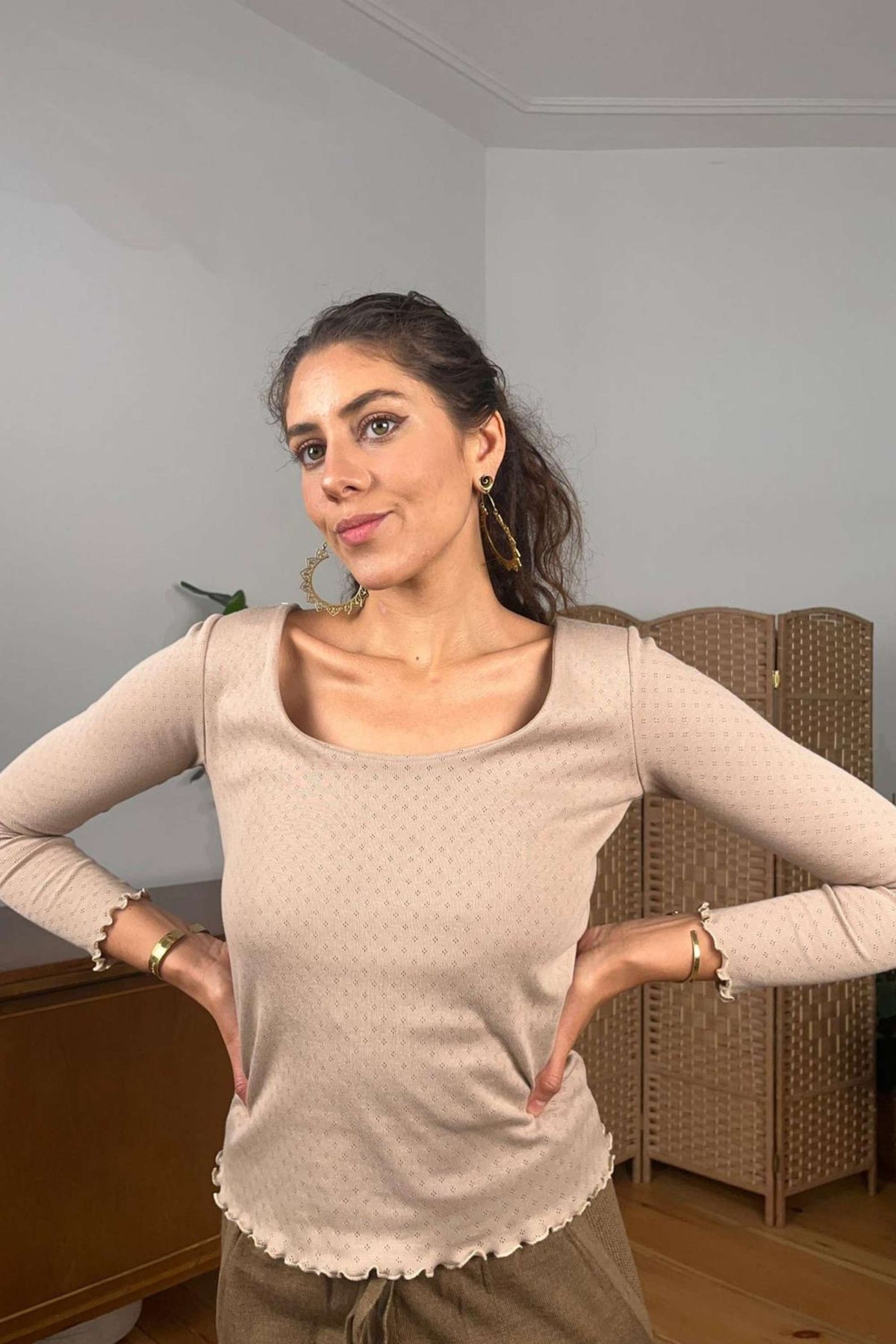 Ein vielseitiges Wohlfühlteil, das sich mühelos stylen lässt – besonders harmonisch mit unseren Sofia-Hosen, aber auch wunderbar zu Jeans, unserem Lunara Leinen Maxirock oder direkt auf der Haut. Für kältere Tage lieben wir unsere Levana Musselin Wickeltops über dem Pointelle-Shirt. Weich, feminin und für fast jeden Anlass gemacht, begleitet es dich vom entspannten Morgen bis zum gemütlichen Abend. Ein Oberteil, in dem man sich sofort zuhause fühlt – und in dem man nicht einfach nur steckt, sondern gerne lebt.
