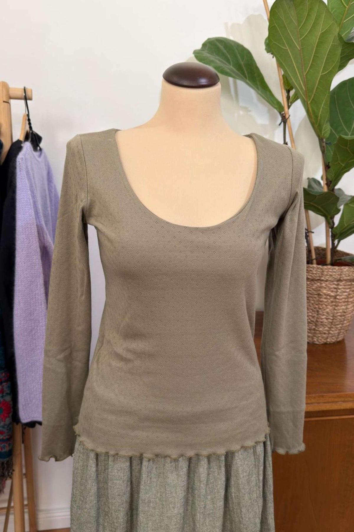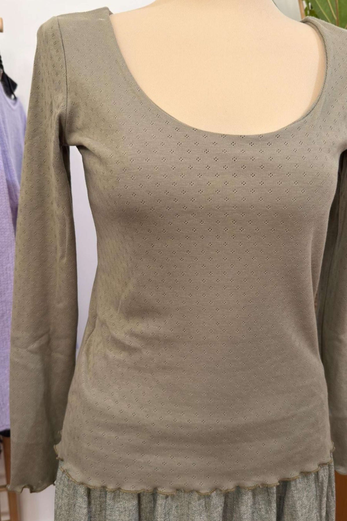 Dieses wundervoll weiche Longsleeve ist ein echtes Lieblingsstück für alle, die natürliche Stoffe lieben und Wert auf Details legen. Gefertigt aus feiner Pointelle-Baumwolle, umhüllt es deine Haut mit Leichtigkeit, Atmungsaktivität und einer subtilen Eleganz, die man sieht und spürt.