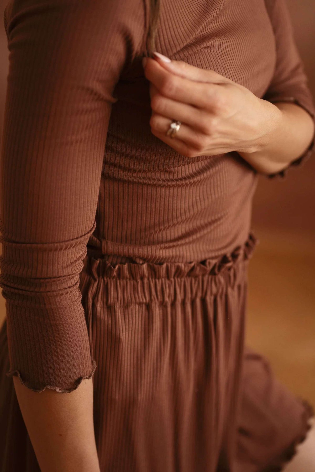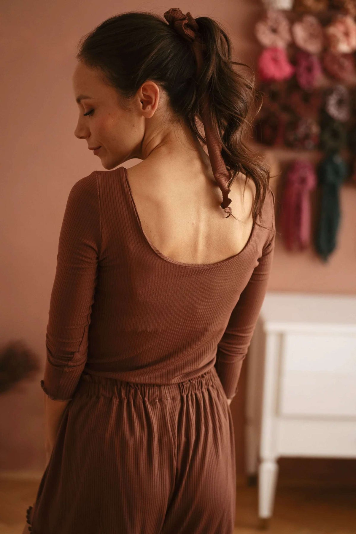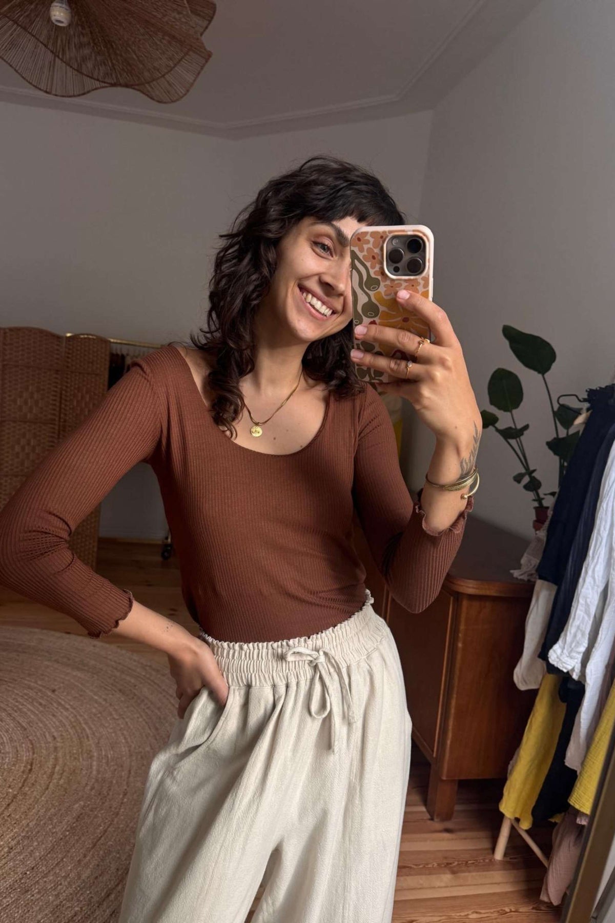 Die zarte Rippstruktur verleiht dem Oberteil eine elegante Linienführung, während der leichte Stretchanteil maximale Bewegungsfreiheit bietet. Wir lieben das Modal-Shirt zu unseren Sofia-Hosen. Für kältere Tage eignet sich das Oberteil ideal auch als Layering Basis für unser Calista-Kleid. Eine wunderschöne Kombi ist auch unser Levana Musselin Wickeltop über dem Modal-Shirt. Ein Oberteil, in dem frau (man) sich sofort zuhause fühlt – und in dem man nicht einfach nur steckt, sondern gerne lebt.