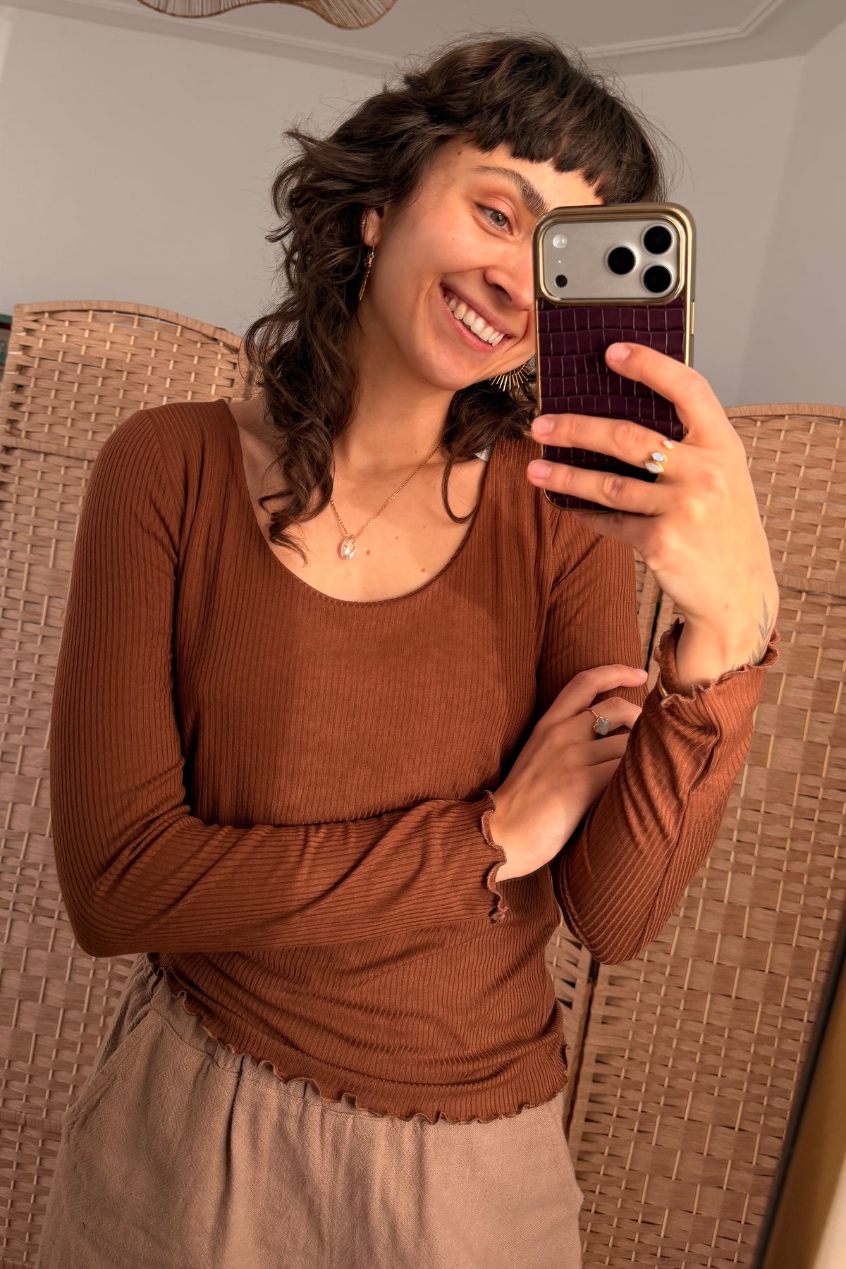 Die zarte Rippstruktur verleiht dem Oberteil eine elegante Linienführung, während der leichte Stretchanteil maximale Bewegungsfreiheit bietet. Wir lieben das Modal-Shirt zu unseren Sofia-Hosen. Für kältere Tage eignet sich das Oberteil ideal auch als Layering Basis für unser Calista-Kleid. Eine wunderschöne Kombi ist auch unser Levana Musselin Wickeltop über dem Modal-Shirt. Ein Oberteil, in dem frau (man) sich sofort zuhause fühlt – und in dem man nicht einfach nur steckt, sondern gerne lebt.