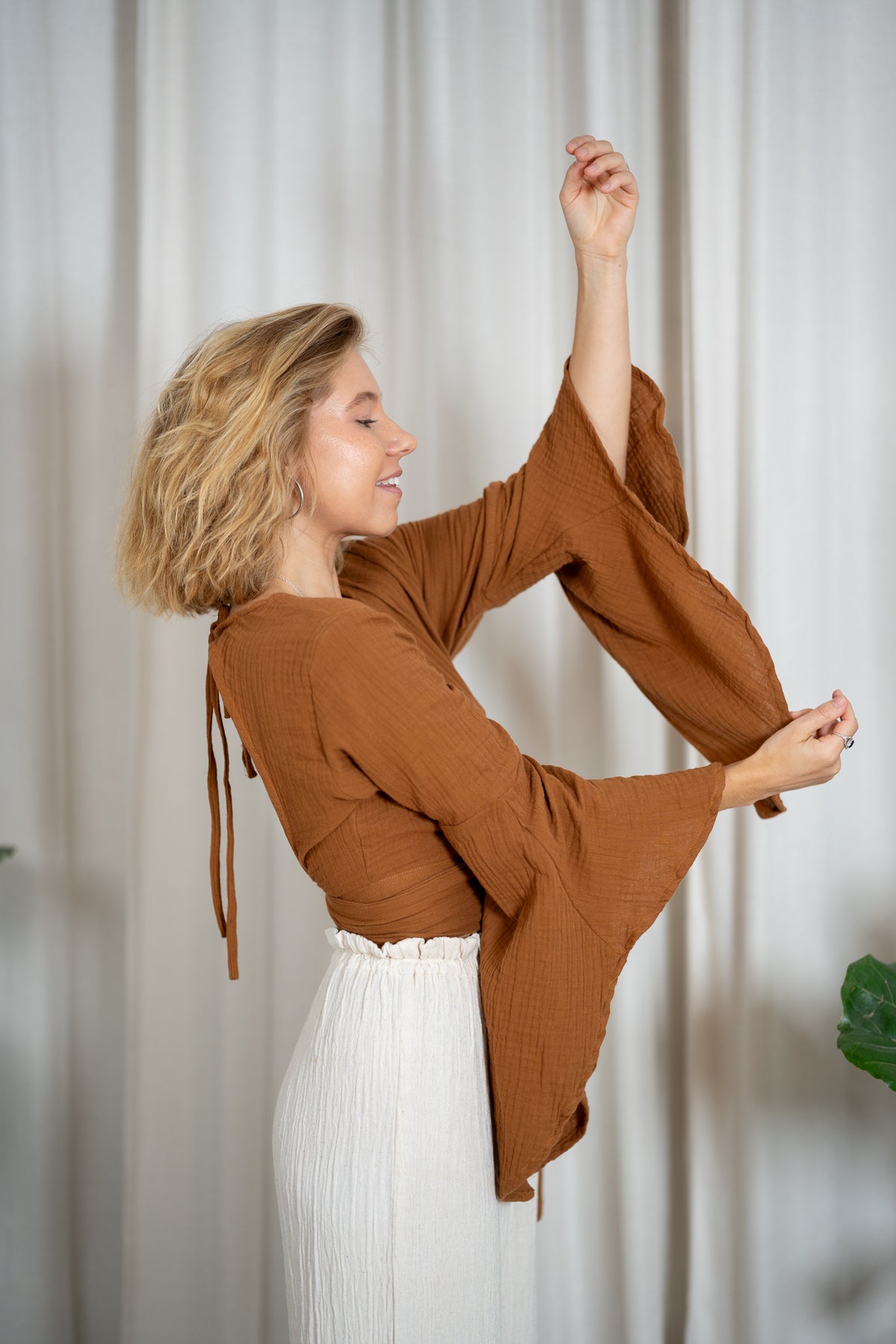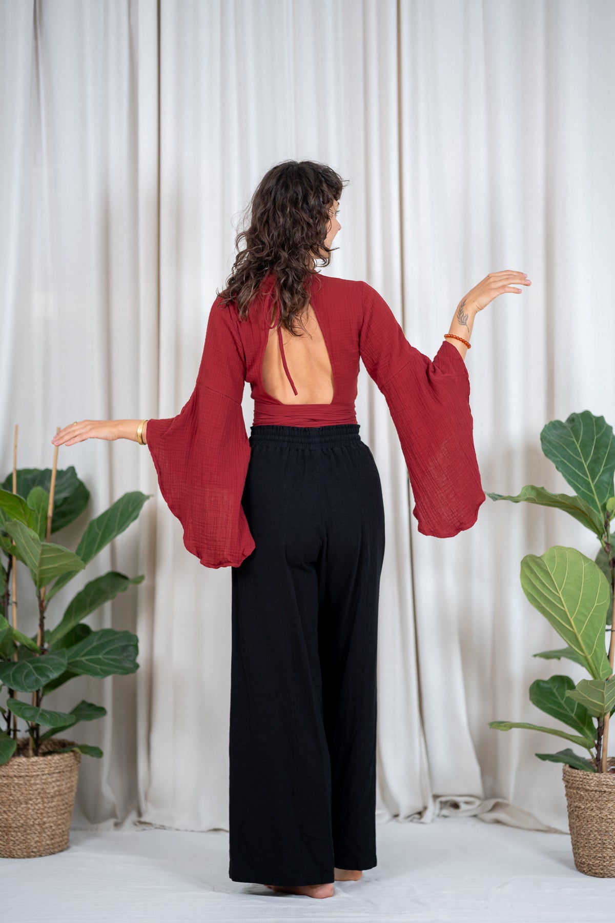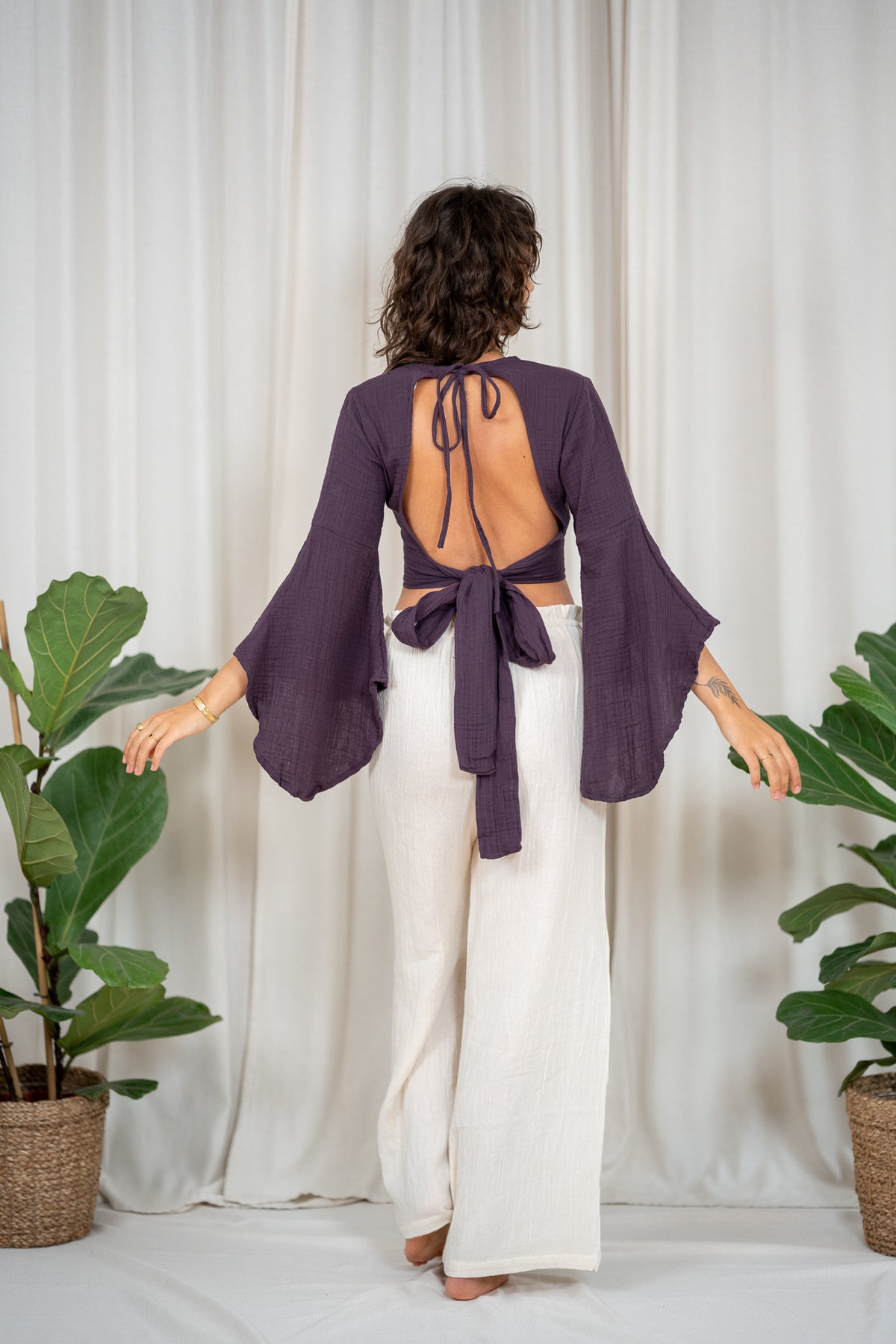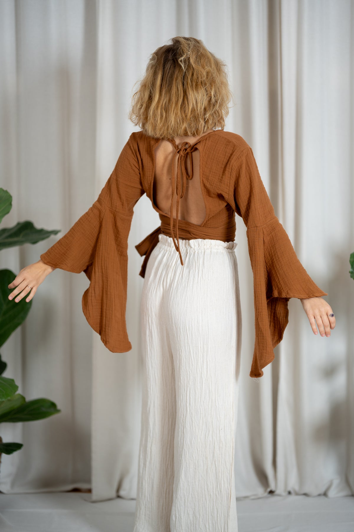An elfin top with butterfly sleeves and various tying options. You can tie it at the back, front or side. The top has a deep V-neck at the front and another tying option at the back as well as a back cutout.