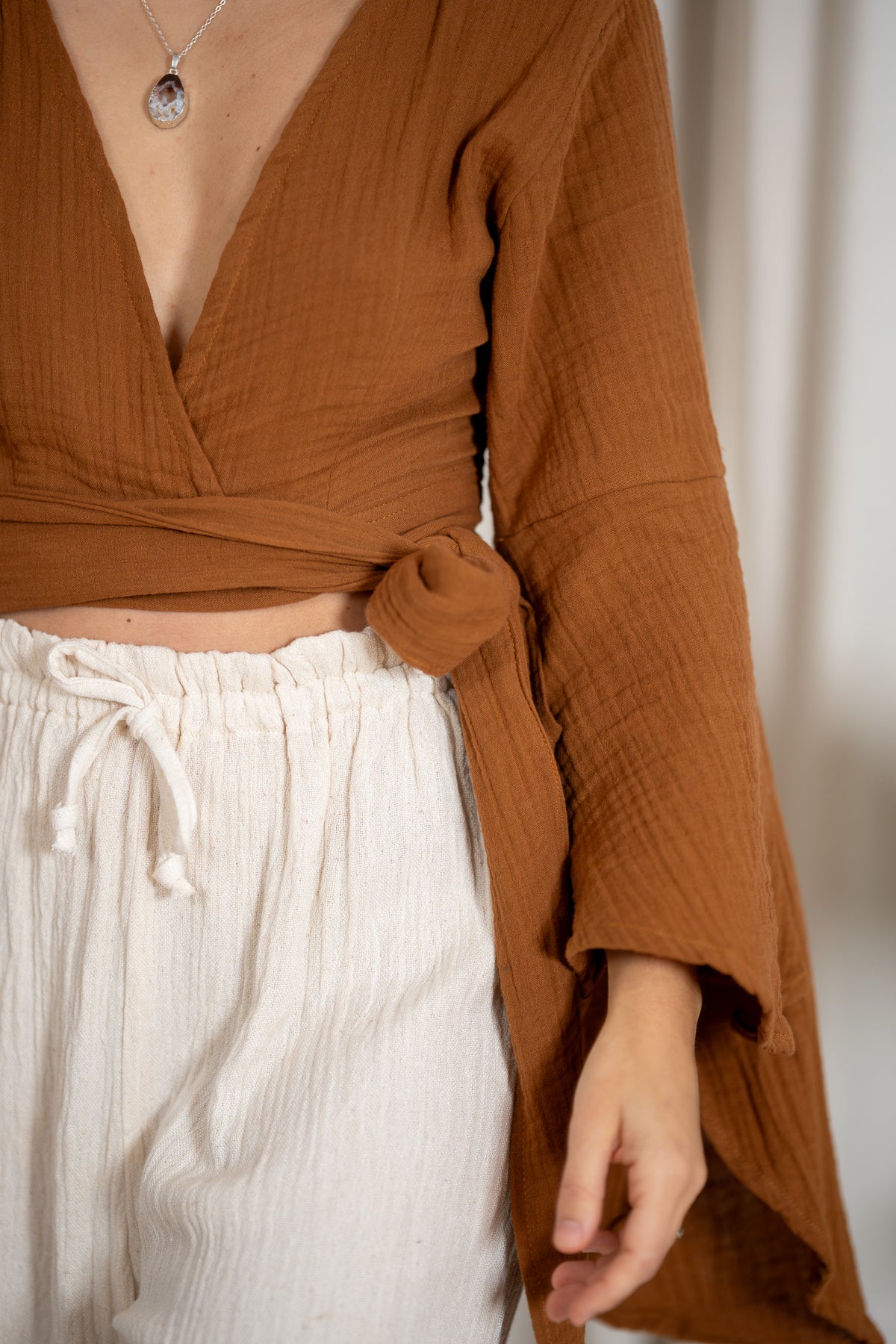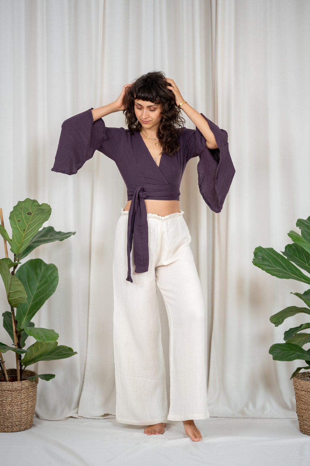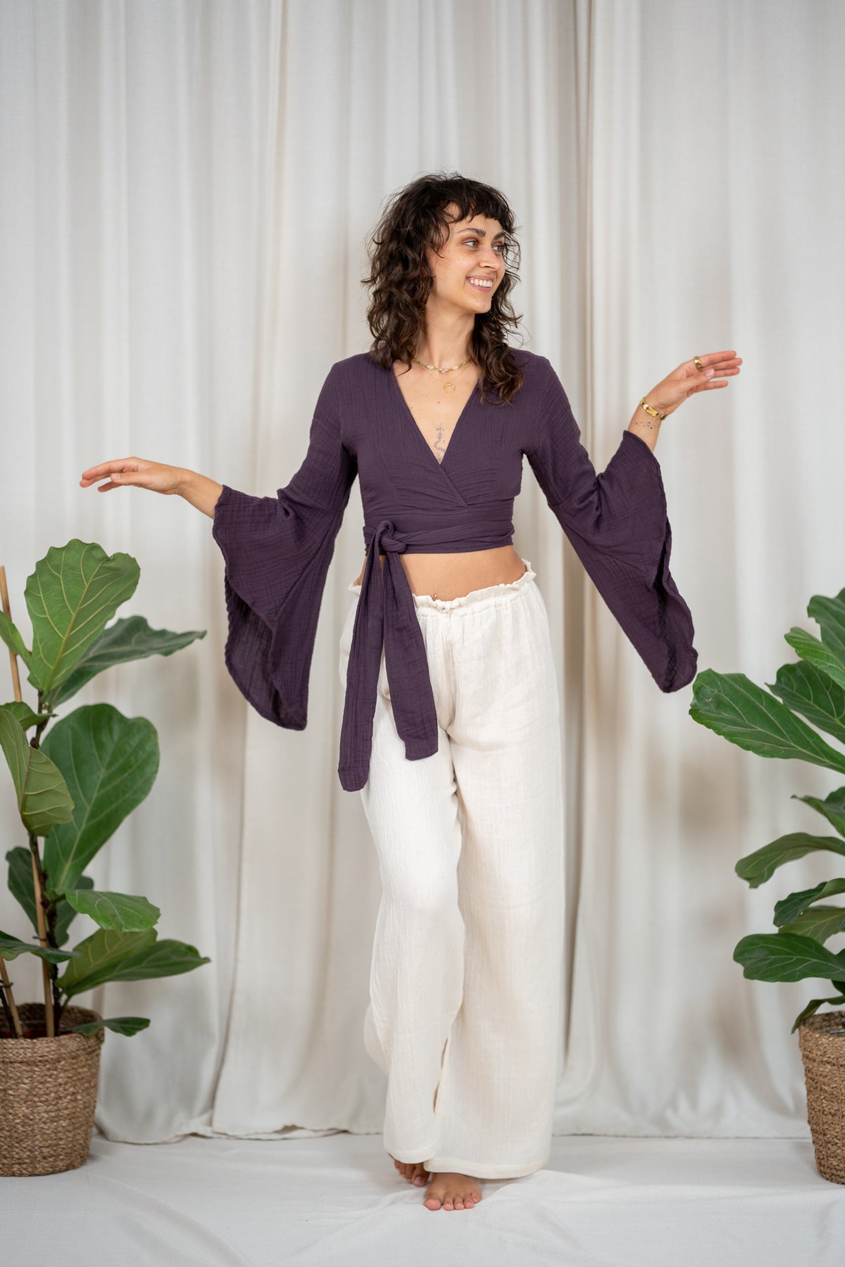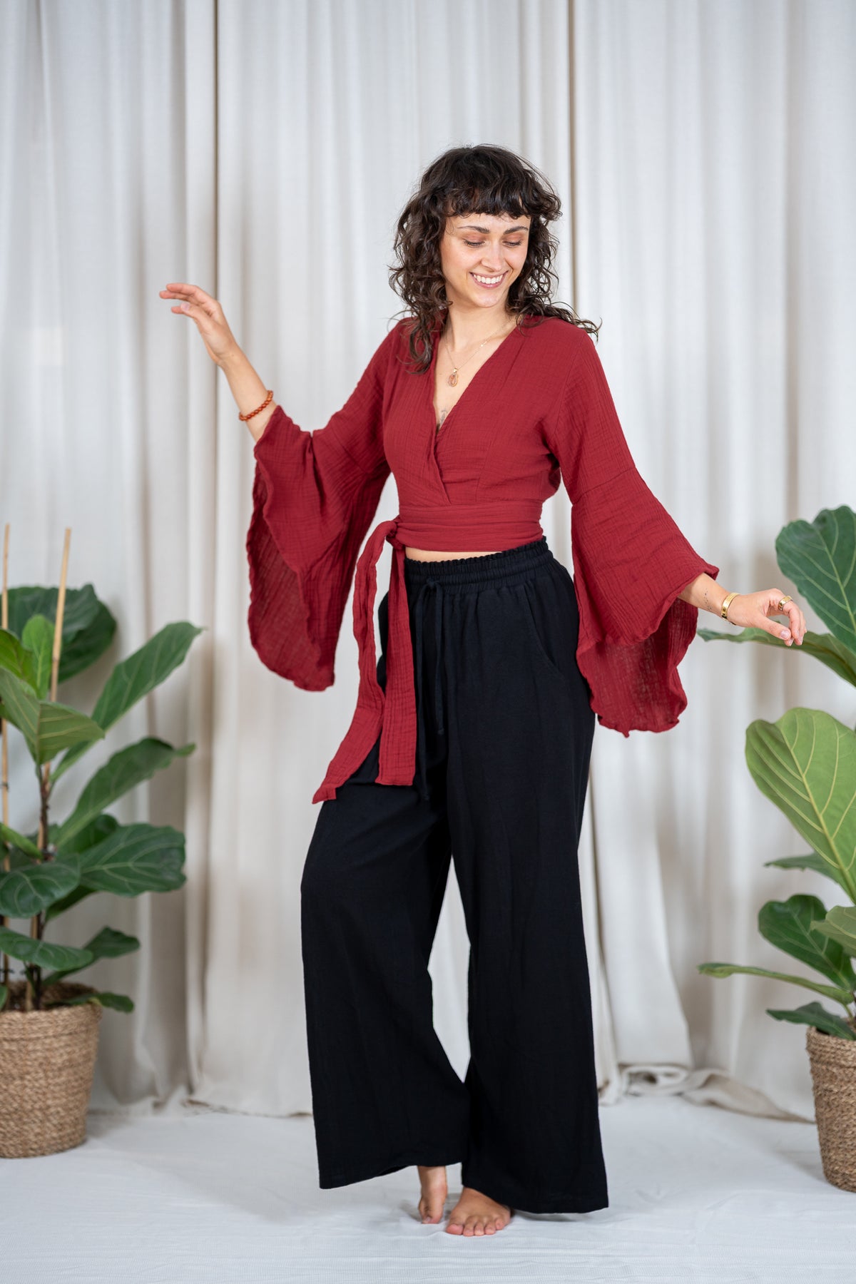 An elfin top with butterfly sleeves and various tying options. You can tie it at the back, front or side. The top has a deep V-neck at the front and another tying option at the back as well as a back cutout.